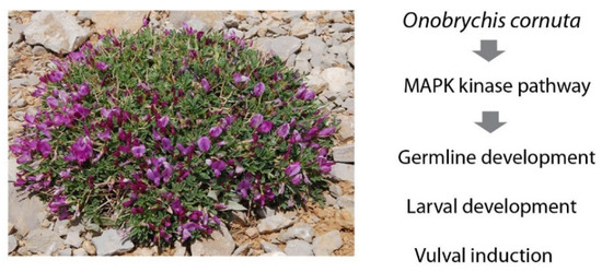 O. Cornuta extract induces the upregulation of the MAPK kinase pathway, resulting in germline abnormalities and influencing worm survival. Our observation highlights that not only does O. cornuta itself lead to the upregulation of the MAPK pathway, but the compounds within the O. cornuta extract also play a significant role in this process. This collective activation of the MAPK pathway underscores its pivotal involvement in influencing germline abnormalities and impacting worm survival. Our observation highlights that not only does O. cornuta itself lead to the upregulation of the MAPK pathway, but the compounds within the O. cornuta extract also play a significant role in this process. This collective activation of the MAPK pathway underscores its pivotal involvement in influencing germline abnormalities and impacting worm survival. A photograph capturing the exquisite bloom of Onobrychis cornuta (L.) Desv. Photographed by Ori Fragman-Sapir (https://flora.org.il/en/plants/ (accessed on 13 December 2023) [46]).