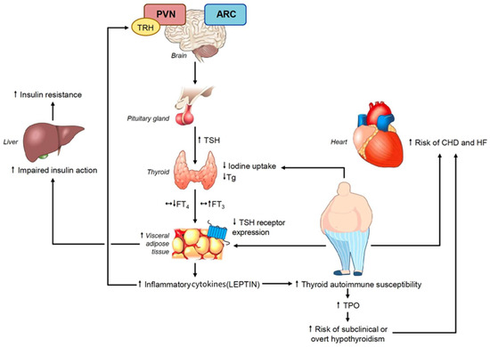 The association between leptin levels and autoimmune thyroid disease (AITD) has been assessed in obese patients in various studies [42,43] which suggest that thyroid peroxidase antibodies (TPOAb) are more frequent in obese patients and leptin levels can be associated with Hashimoto thyroiditis (HT), independent of bioanthropometric variables [42]. A meta-analysis, which analyzed 14 studies, found a causal relationship between obesity and SHypo [43]. Obese populations had an increased risk of SHypo (OR = 1.70, 95% CI 1.42–2.03; p < 0.001) and a significant association with HT (OR = 1.91; 95% CI 1.10–3.32; p = 0.022) supporting the understanding that adiposity is a risk factor for HT and SHypo. Increased leptin levels can play a crucial role affecting the immune system and the inflammatory response and lead to a rising production of TPOAb [43].