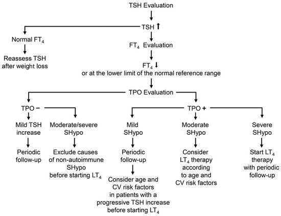 Subclinical hypothyroidism (SHypo) is an early condition of thyroid hormone deficiency in which free thyroxine levels are at the lower limit of their normal reference range with a consequent increase in serum thyroid stimulating hormone (TSH), which is already outside of its reference range [1,2,3]. Subclinical hypothyroidism develops in 4–20% of the adult population and is more common in iodine-sufficient countries [1]. Around 75% of patients with SHypo are affected by a mild form, characterized by a serum TSH concentration, ranging between 4.5–6.9 mIU/L. Serum TSH usually normalizes during the follow-up in patients with mild SHypo and therefore this disorder can be reversible and remain untreated in asymptomatic patients without cardiovascular risk factors and in unpregnant women [1,2]. About 20% of adult patients with SHypo have a moderate form of thyroid hormone deficiency, with a TSH concentration between 7.0–9.9 mIU/L. Only 5% have severe dysfunction with a TSH concentration ≥10 mIU/L [3]. Moderate and severe SHypo have been associated with an increased risk of progression to overt disease.