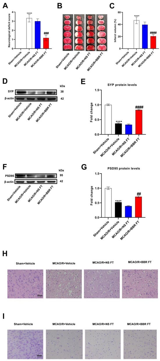 BBR improves stroke outcomes by regulating gut microbiota. (A) Neurological scores were measured 24 h after MCAO/R (n = 18). (B) TTC staining was performed 24 h after MCAO/R (n = 6). (C) The percentage of infarct volume to Sham value was analyzed 24 h after MCAO/R (n = 6). (D,E) Western blot and quantitative analysis showed the expression of SYP in mice brain (n = 6). (F,G) Western blot and quantitative analysis showed the expression of PSD95 in mice brain (n = 6). (H,I) Representative images of ischemic cerebral tissue with HE staining or Nissl staining (n = 6). Scale bar, 50 µm. Results were presented as mean ± SD. **** p < 0.0001 versus the Sham + Vehicle group; ## p < 0.01, ### p < 0.001, #### p < 0.0001 versus the MCAO/R + Vehicle group.