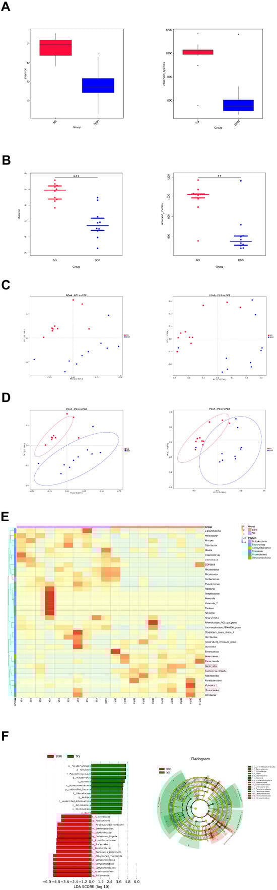 BBR administration increases the abundance of butyric−producing bacteria in mice. (A,B) Alpha diversity is expressed through the Shannon diversity index (n = 10). (C) The β−diversity (PCoA) of gut microbiota in each group (n = 10). (D) The relative abundance and the sample similarity of microbiota in each sample as well as the related heatmap clustering analysis (n = 10). (E,F) Significantly discriminative taxa between each group detected by linear discriminant analysis effect size (LDA effect size) and the taxonomic cladogram (n = 10). Data were presented as mean ± SD. ** p < 0.01, *** p < 0.001 versus the NS group.
