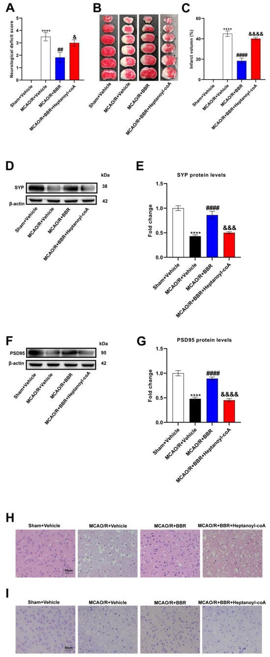 To test whether berberine improves stroke outcomes by promoting butyric acid synthesis, we used a butyric acid synthesis inhibitor, heptanoyl-CoA, which inhibits the key enzyme in butyrate synthesis: butyryl-CoA acetate-CoA transferase (BUT). MCAO/R mice showed higher neurological deficit scores as well as infarct volume, indicating that the nerve function was severely impaired. BBR could significantly reduce the neurological deficiency scores as well as infarct volume of the MCAO/R group, while the inhibitor of butyrate synthesis, heptanyl-CoA, could reverse the above results (Figure 5A–C). Western blot analysis showed that the expression of SYP and PSD95 was strikingly lower in the model mice than the controls, indicating that synaptic function was severely impaired. BBR administration could dramatically increase the content of SYP and PSD 95 and improve the synaptic function, but the administration of heptanoyl-CoA reversed this effect (Figure 5D–G). HE and Nissl staining showed nuclear atrophy, cell membrane vacuolation and Nissl bodies volume reduction in the MCAO/R + Vehicle group. BBR significantly reduced brain injury in the MCAO/R group, but the improvement of BBR for brain damage is inhibited when co-administered with heptanoyl-CoA (Figure 5H,I). Collectively, these results suggested that BBR ameliorates stroke outcomes in mice by enhancing butyrate synthesis.