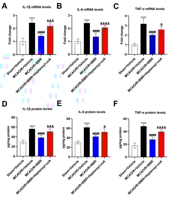 BBR inhibits the level of pro-inflammatory factors in the brain of MCAO/R mice by promoting the biosynthesis of butyric acid. (A–C) The expression of IL-1β, IL-6, and TNF-α mRNA in the mice brain (n = 6). (D–F) The expression of IL-1β, IL-6 and TNF-α in the mice brain (n = 6). β-actin was used as the internal control. Data were presented as mean ± SD. **** p < 0.0001 versus the Sham + Vehicle group; #### p < 0.0001 versus the MCAO/R + Vehicle group; & p < 0.05, &&& p < 0.001, &&&& p < 0.0001 versus the MCAO/R + BBR group.