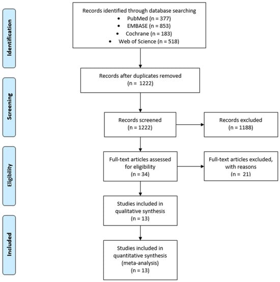 The literature search resulted in 1222 articles after the removal of duplicates (Figure 1). During the first screening, we excluded 1188 articles, including meta-analyses, systematic reviews, literature reviews and editorials, as well as in vitro studies, studies on animals, case reports, observational studies and quasi-experimental studies. Moreover, we included articles written only in English. After full-text screening, 13 articles qualified for analysis.