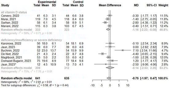 We analyzed the effect of vitamin D3 supplementation on the length of COVID-19 hospitalization using the subgroup analysis of clinical trials. Overall, the analysis showed no difference between vitamin D3 supplementation and control groups (MD = −0.78; 95% CI [−1.97; 0.47]; p = 0.23; I2 = 68.2%), as shown in Figure 2.