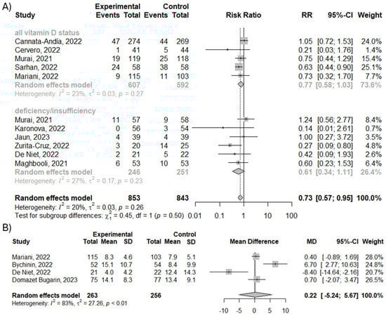 We analyzed the effect of vitamin D3 supplementation on the number of ICU admissions and the length of stay in the ICU. Overall, subgroup analysis showed that supplementation with vitamin D3 reduces the risk of ICU admission by 27% (RR = 0.73; 95% CI [0.57; 0.95], p = 0.02, I2 = 19.6%), with no differences between analyzed groups (p = 0.50), as shown in Figure 3A. However, the analysis showed no difference between vitamin D3 supplementation and control groups in case of length of stay in the ICU (MD = 0.22; 95% CI [−5.24; 5.67]; p = 0.94; I2 = 82.7%), as shown in Figure 3B.