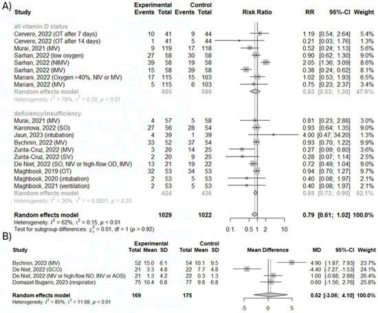 (A) The efficacy of vitamin D3 supplementation on number of cases requiring any supplemental oxygenation. (B) Mean difference in duration of any supplemental oxygenation. OT—oxygen therapies; MV—mechanical ventilation; NIMV or NIV—non-invasive mechanical ventilation or non-invasive ventilation; IMV—invasive mechanical ventilation; OD—oxygen devices; SO—supplemental oxygenation; SV—progression to a superior ventilation modality; SCO—supplemental conventional oxygen [20,21,22,23,24,25,27,28,30,31,32].