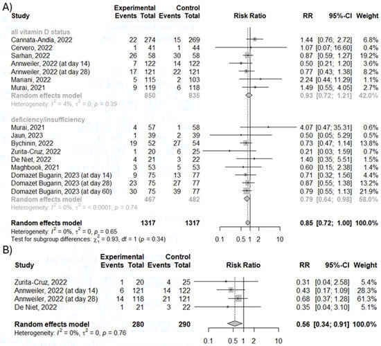 We also checked whether vitamin D3 supplementation influenced the number of cases requiring any supplemental oxygenation and the duration of any supplemental oxygenation. However, our subgroup analysis showed no significant effect of vitamin D3 supplementation on the number of cases requiring any supplemental oxygenation (RR = 0.79; 95% CI [0.61; 1.02], p = 0.07, I2 = 62.2%) (Figure 4A), as well as no differences between analyzed groups in case of duration of any supplemental oxygenation (MD = −0.52; 95% CI [−3.06; 4.10]; p = 0.78; I2 = 84.7%), as shown in Figure 4B.