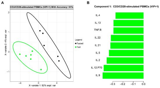 T-cell-stimulated (CD3/CD28) PBMCs from fasted and fed subjects with T2D produce different cytokine profiles. (A): PLSDA 2D projection of fasted (n = 5) and fed (n = 6) T2D subjects based on cytokine production generated a highly accurate model (91%). (B): Top ranked cytokines from PLSDA with a VIP Score > 1 that distinguished fasted and fed subjects’ cells.