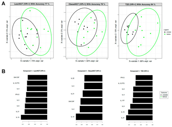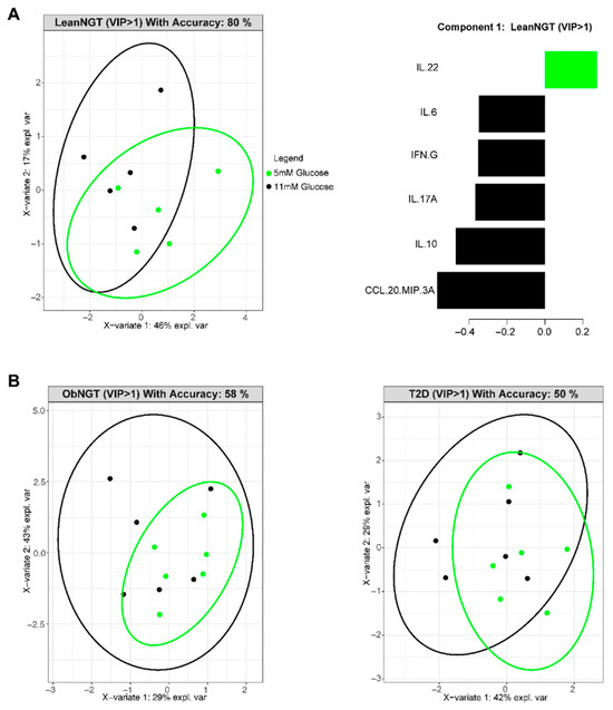 Hyperglycemia in vitro does not alter cytokine production in CD3/CD28-stimulated PBMCs from fasted subjects with obesity/T2D. (A,B): PLSDA 2D projection of cytokine production from PBMCs of a cohort with a lean BMI (n = 5) or obesity BMI (n = 6) with normal glucose tolerance/NGT or a cohort with obesity and T2D (n = 6). Cells were activated with CD3/CD28 beads for 40 h in the presence of either 5 mM (green dots) or 11 mM (black dots) D-glucose. An accuracy of ≥70% indicates a predictive model. (A) (right): PLSDA-ranked cytokines in the most-distinguishing component (component 1) for those produced by cells from the leanNGT cohort with a VIP score ≥ 1. Ranking is from most predictive (bottom) to least predictive (top) of 5 mM (black) or 11 mM (green) glucose conditions.