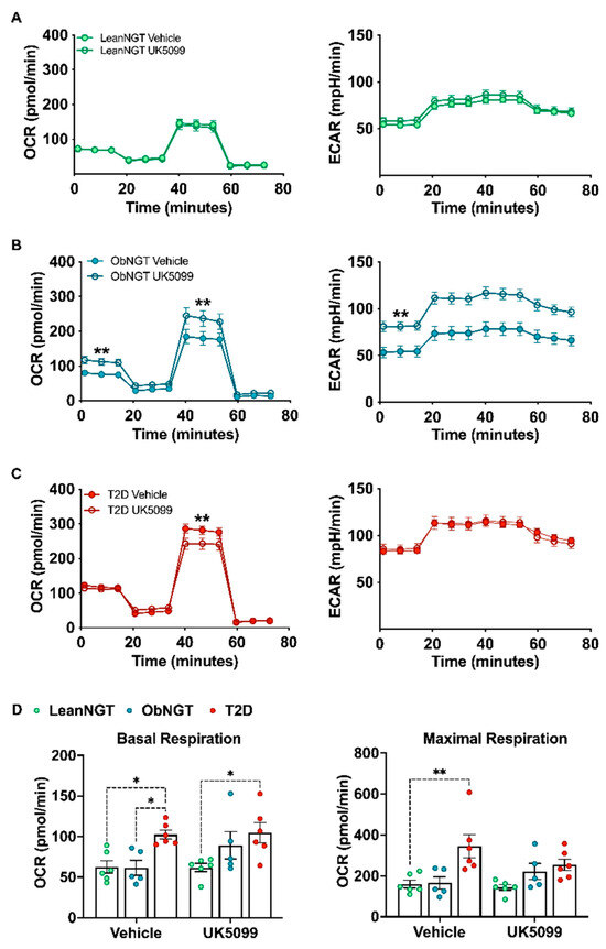 Inhibition of mitochondrial pyruvate import inversely changes oxidative metabolism in CD4+ T-cells, depending on glycemic control but not BMI. Oxygen consumption rate (OCR) and extracellular acidification rate (ECAR) of total CD4+ T-cells from a cohort with (A) lean BMI (n = 6, green dots) or (B) obese BMI (n = 5, blue dots) with NGT or (C) obesity and T2D (n = 6, red dots) that were activated with CD3/CD28 beads for 40 hr in the presence of either vehicle or UK5099. (D) Basal and maximal respiration with vehicle or UK5099 treatment. Differences in basal and maximal OCR between treatments (A–C) were assessed by a paired t-test using the group means at measurements 0–20 min (basal) and 40–60 min (maximal). Differences in ECAR between treatments within each cohort were assessed by a paired t-test of the average ECAR of measurements 1–3 (0–18 min). Differences in panel D were assessed using sample means by a two-way ANOVA and Bonferroni’s multiple comparisons. *: p < 0.05, **: p < 0.01.