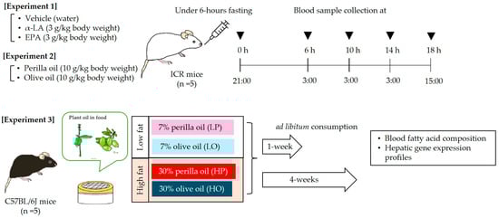 Twenty-five male ICR and forty C57BL/6 mice were purchased from Japan SLC (Shizuoka, Japan). They were provided ad libitum with deionized water and powdered AIN-93G (LS) diet, which included 7% soybean oil (Table 1); and they were housed at a temperature of 23 ± 2 °C, at a humidity of 55 ± 10%, and under a 12 h light/dark cycle (lights on at 09:00). After an acclimation period, the following three experiments were performed (Figure 1). The number of mice in each experimental group was set to 5 to reduce the number of experimental animals used and to allow for statistical analysis even if some mice unavoidably dropped out due to lacerations or other reasons. In order to reduce the number of animals used, only the vehicle solvent group in Experiment 1 was limited to three animals per group. In the three experiments conducted in this study, no mice dropped out during the experimental period. To minimize potential confounders, in Experiments 1 and 2, mice were assigned a dose number, the order of administration to the mice was randomized, and administration and blood sampling were performed without the practitioner knowing the type of drug administered. Similarly, in Experiment 3, blood samples and other procedures were performed without the researcher knowing which diet was consumed.