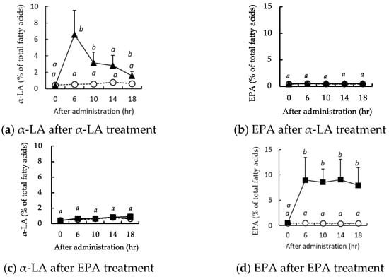 Changes in the circulating α-linolenic acid (α-LA) and eicosapentaenoic (EPA) concentrations of the mice after a single administration. The circulating concentrations of α-LA (a) and EPA (b) following α-LA administration, and the circulating concentrations of α-LA (c) and EPA (d) after EPA administration are shown. Vehicle treatment group (◯, n = 3); α-LA group (▲, n = 5); and EPA group (◼, n = 5). Data are mean ± SD. Differing alphabetical superscripts indicate significant differences (p < 0.05).
