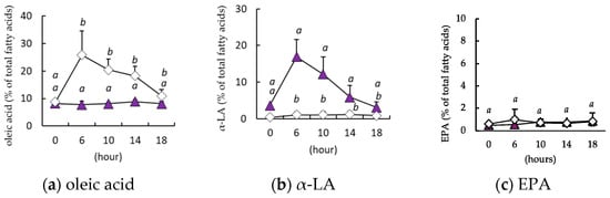 When olive oil or perilla oil was orally administered to mice after 6 h of fasting, the circulating concentrations of oleic acid (Figure 4a) and α-LA (Figure 4b), the major fatty acid components of each oil, peaked 6 h later and then declined, returning to their initial concentrations after 18 h. However, the circulating concentration of EPA did not change during the 18 h following the administration of either olive oil or perilla oil (Figure 4c).