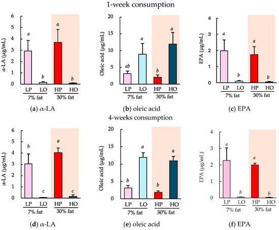 Effects of the ad libitum consumption of perilla oil or olive oil on the plasma α-LA, oleic acid, and EPA concentrations of the mice. After the ad libitum consumption of perilla oil or olive oil for 1 week (a–c) or 4 weeks (d–f), the plasma concentrations of α-LA (a,d), oleic acid (b,e), and EPA (c,f) were evaluated. The diets were either low-fat (7%) or high-fat (30%). LP, low-fat diet with perilla oil; LO, low-fat diet with olive oil; HP, high-fat diet with perilla oil; and HO, high-fat diet with olive oil. Data are mean ± SD (n = 5). Differing alphabetical superscripts indicate significant differences (p < 0.05).