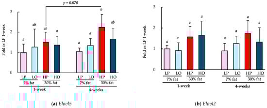 The effects of consuming a 7% low-fat diet or a 30% high-fat diet containing perilla oil or olive oil as the principal lipid component for 1 or 4 weeks on the expression of key genes involved in fatty acid synthesis, Elovl2 and Elovl5, are shown in Figure 6. The consumption of the HP diet for 4 weeks significantly increased Elovl5 expression in the liver vs. the consumption of the LP diet over both 1 and 4 weeks (Figure 6a). The HO group showed a similar trend with Elovl5 expression being 48% higher after 4 weeks of consumption (p = 0.078 with Student’s t-test). Four weeks of HP diet consumption resulted in a similar trend with respect to Elovl2 expression (Figure 6b), but there were no differences between 1 and 4 weeks of consumption.