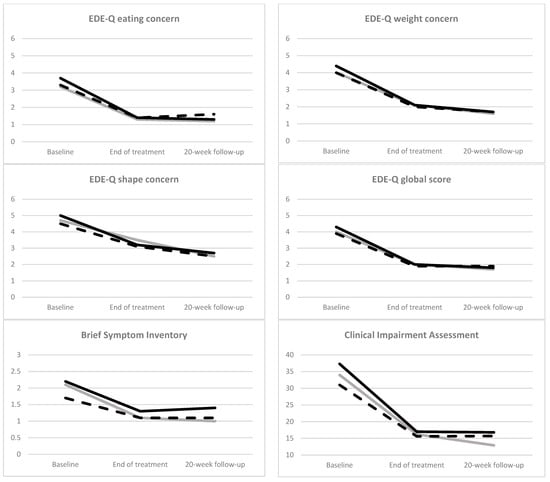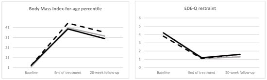 The mixed model analysis indicated a significant change over time in all measured variables (Figure 1). However, no significant time–group interaction was found in the variables investigated (all ps > 0.05). Moreover, the three groups showed similar “good BMI outcome” and “full response” rates at both EOT and follow-up (Table 3).