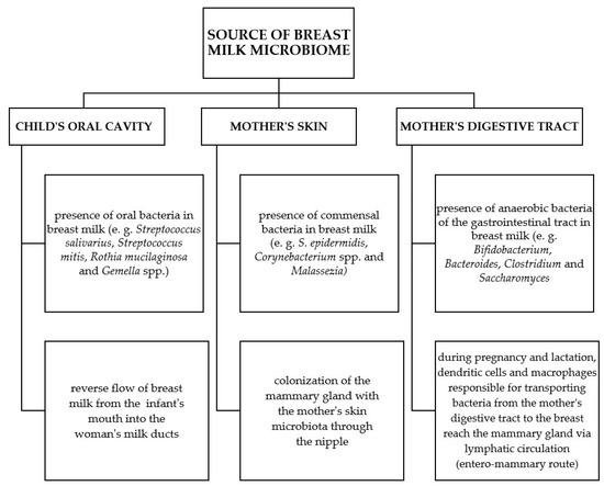 The literature on the subject indicates that the microbiome of human milk has common features with the microbiome of the gastrointestinal tract of a breastfeeding mother. The genus Saccharomyces, which includes some of the most abundant fungi identified in the gastrointestinal tract, is also one of the main types of fungi present in human milk [44]. Human milk also contains the following types of bacteria: Bifidobacterium, Veillonella, Bacteroides, Parabacteroides, Clostridium, Collinsella, Faecalibacterium, Coprococcus, and Blautia [33,45,46,47,48,49,50]. These bacteria are anaerobes that would not survive in the aerobic conditions of the child’s mouth and on the mother’s skin. Hence, the hypothetical “entero-mammary route”, which would explain the presence of the previously mentioned bacteria in human milk. Dendritic cells take up live bacteria by disrupting the intestinal epithelium. Then, for several days in the mesenteric lymph nodes, these cells sequester live bacteria, which are transferred through the lymphatic system to individual parts of the body, including the mammary gland [22]. Perez et al. [51], in studies on a group of mice, showed that bacteria could be identified 60% more often in the mesenteric lymph nodes of pregnant mice compared to mice that were not pregnant. The obtained results suggest that the ability of bacteria to translocate increases during lactation [51]. During this period, the number of lymphatic vessels in the mammary gland tissues increases. This is confirmed by research conducted on a group of mice that were orally administered two genetically modified strains of lactic acid bacteria (Lactococcus lactis MG1614 and Lactobacillus salivarius PS2). These bacteria were detected in milk and mammary tissue in a group of pregnant mice but not in a control group [52]. Subsequent studies indicate that some species of bacteria typical of the gastrointestinal tract (Escherichia coli, Faecalibacterium, and Eubacterium spp.) occasionally enter the mammary gland. Hence, the conclusion that only some bacteria have the ability to get from the digestive tract to the mammary gland [51]. It is also important that the microbiome of human milk can be modified, e.g., by diet or pre/probiotics used by a breastfeeding woman. Jiménez et al. [33] used a daily oral dose of Lactobacillus salivarius CECT5713 and Lactobacillus gasseri CECT5714 or a placebo in a group of breastfeeding women with diagnosed mastitis. At the beginning of the study, the average number of staphylococci in human milk in both groups was comparable (probiotic group 4.74 and control group 4.81 log10 colony forming unit (CFU)/mL). However, on the 30th day of the study, the average number of Staphylococcus spp. in the probiotic group (2.96 log10 CFU/mL) was significantly lower than in the control group (4.79 log10 CFU/mL), and L. salivarius CECT5713 and L. gasseri CECT5714 could be isolated from human milk samples in 6 out of 10 cases. Moreover, on day 14 of the study, no symptoms of mastitis were observed in the group of women using probiotics, and in women from the control group, symptoms of mastitis persisted throughout the study period [53]. In turn, when it comes to the impact of a breastfeeding woman’s diet on the microbiome of human milk, it has been proven that the gastrointestinal microbiota of breastfed children depends on the mother’s vegetarian diet [54].