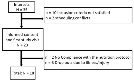 They were healthy and generally physically active but not trained specifically. In addition, subjects had to be between 18 and 35 years old, not consume a vegan diet, be non-smokers, have no acute injuries or chronic illnesses, not take any medication, and have a running time for 10,000 m of <55 min for women and <50 min for men. High performance athletes with training volumes of >100 km × wk−1 and individuals trained specifically for national and international competitions with >10 training sessions × wk−1 or >10 h training time × wk−1 were also excluded [20,21,22].