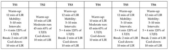 Six-day training plan consisting of four interval units with 120% of the LT(D) and two endurance runs with 65% of the LT(D) as load intensity specification (accompanying warm-up and cool-down phase included). LT(D) = lactate threshold calculated by the D-mod method. LIR = low intensity running.