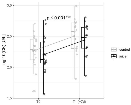 Interaction diagram for CK in the control and juice intervention (before and after an endurance exercise interval of 6 days). CK = creatine kinase. *** ≤ 0.001.