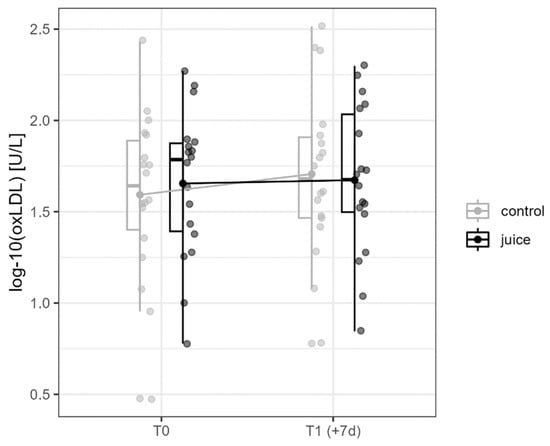 The concentrations of oxLDL, as a marker of oxidative stress, were analyzed in serum at T0 and T1 (+7d) to investigate the effect of training and juice and their possible interactions on endogenous oxidative stress level (Figure 5). No significant changes were detected over time between T0 and T1 (+7d) (p = 0.120, η2 = 0.040). There were also no significant differences between the groups (p = 0.632, η2 = 0.000), and no significant interactions between the group and time were observed (p = 0.354, η2 = 0.010).
