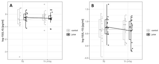 To analyze the connection between oxidative stress (related to physical activity), inflammatory responses, and beverage intakes, the serum concentrations of the pro-inflammatory cytokine IL-6 and the anti-inflammatory cytokine IL-10 were determined at T0 and T1 (+7d) (Figure 6).