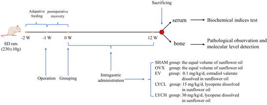 One week after surgery, ovariectomized rats were randomly divided into 4 groups with 10 in each, namely the OVX, estradiol valerate (EV), high-dose LYC (LYCH) and low-dose LYC (LYCL) groups (Figure 1). Rats in the EV, LYCH and LYCL groups were orally administrated with estradiol valerate tablets (0.1 mg/kg), and LYC (LYCH, 30 mg/kg; LYCL, 15 mg/kg) dissolved in sunflower oil, respectively. Rats in the OVX and SHAM groups were orally gavaged with an equal volume of the vehicle. During the treatment, body weight was recorded every week. After 12 weeks of intervention, serum was collected from the abdominal aorta of anesthetized rats. Then, the uterus was removed and weighed. And the bilateral tibias and femurs were dissected from the animal body. The samples were then either stored at −80 °C or soaked in 10% neutral formalin for further experiments. The in vivo experiments were performed from June 2019 to August 2021.