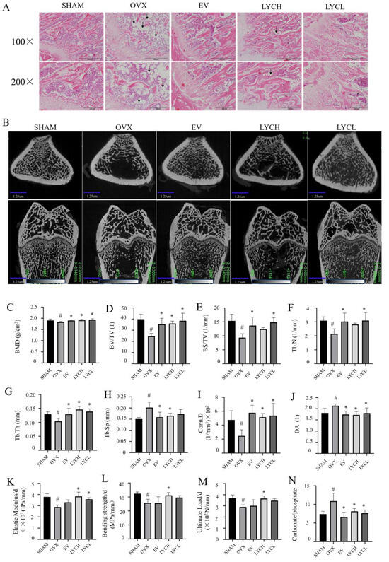 As shown in Figure 2A, H&E staining revealed that the trabecular bone in the distal femurs of the SHAM group was orderly distributed and appeared normal meshwork. By contrast, the trabecular bone in the OVX group became thinner, and irregular and showed a disorganized mesh structure. In addition, the lipid droplets (indicated by the black arrow) were much more obvious in the femurs of the OVX group than those in the SHAM group. Interestingly, the trabecular bone and the number of lipid droplets of the LYC and EV group were almost returned to normal levels and similar to those in the SHAM group.