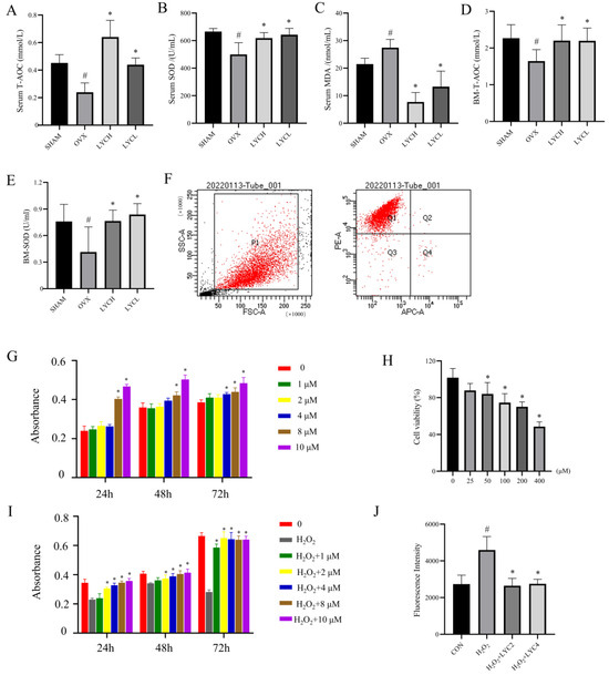 Figure 3. Lycopene inhibits oxidative stress in OVX rats and in BMSCs. Serum and bone marrow levels of oxidative stress markers were determined by biochemical assays, including serum total antioxidant capacity (Serum T-AOC, (A)), serum superoxide dismutase (Serum SOD, (B)), malondialdehyde (Serum MDA, (C)), bone marrow total antioxidant capacity (BM-T-AOC, (D)) and bone marrow superoxide dismutase (BM-SOD, (E)). The primary BMSCs were characterized by flow cytometry (F). Effects of lycopene on BMSCs proliferation with/without H2O2 exposure after 24, 48, and 72 h (GI) were determined by a CCK-8 assay. The intracellular levels of ROS were determined by the DCFH-DA (J). SHAM denotes the sham operation group, OVX denotes the ovariectomized model group, EV denotes the estradiol treatment group, LYCH denotes the high-dose lycopene treatment group, LYCL denotes the low-dose lycopene treatment group. CON denotes the blank control, H2O2 denotes the stimulation with H2O2 for 1 h, LYC2 denotes the 2 μM of lycopene treatment, LYC4 denotes 4 μM of lycopene treatment. n = 5, # vs. the SHAM or CON group, * vs. the OVX or H2O2 group. p < 0.05 was considered statistically significant.