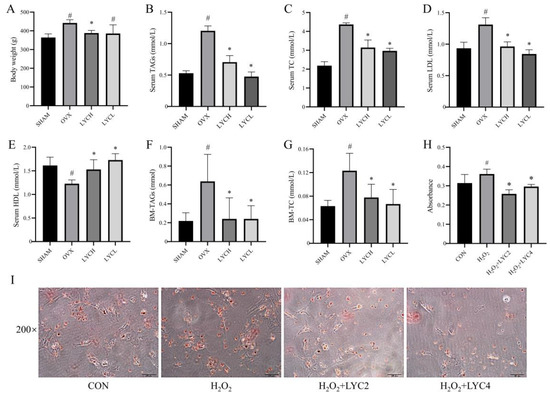 Figure 4. Lycopene improves lipid metabolism in OVX rats and in BMSCs. Body weight (A), serum triacylglycerols (Serum TAGs, (B)), serum total cholesterol (Serum TC, (C)), serum low-density lipoprotein (Serum LDL, (D)), serum high-density lipoprotein (Serum HDL, (E)), bone marrow TAGs (BM-TAGs, (F)) and bone marrow TC (BM-TC, (G)). The Oil Red O staining and its analysis in BMSCs (I,H). SHAM denotes the sham operation group, OVX denotes the ovariectomized model group, EV denotes the estradiol treatment group, LYCH denotes the high-dose lycopene treatment group, LYCL denotes the low-dose lycopene treatment group. CON denotes the blank control, H2O2 denotes the stimulation with H2O2 for 1 h, LYC2 denotes 2 μM of lycopene treatment, LYC4 denotes 4 μM of lycopene treatment. n = 5 (rats), n = 3 (cells), # vs. the SHAM or CON group, * vs. the OVX or H2O2 group. p < 0.05 was considered statistically significant.