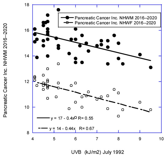 | Pancreatic | 14 − (0.44 × UVB) | 0.67, 0.44, <0.001 |