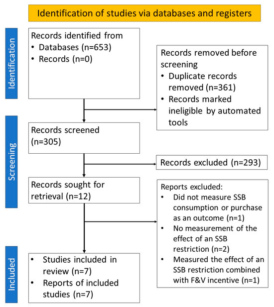 Figure 1 presents the study selection flowchart. We identified 653 articles through keyword and reference searches, including 149 from PubMed, 116 from Web of Science, 198 from Scopus, 28 from Cochrane, and 162 from EBSCO. After removing duplicates, 305 articles underwent title and abstract screening, of which 293 were excluded. The remaining 12 articles were reviewed against the selection criteria. Of these, four articles were excluded for the following reasons: one study only measured the combined effects of an SSB restriction with a fruit and vegetable incentive [23]; one did not measure SSB consumption or purchase as outcomes [24]; two did not include any SSB restriction as an intervention [9,25]; one focused on the effectiveness of a health literacy intervention [9]; and the other focused on the difference in SSB consumption between SNAP and non-SNAP participants [25]. Therefore, a final pool of seven articles [4,17,18,19,20,21,22] was included in the review.