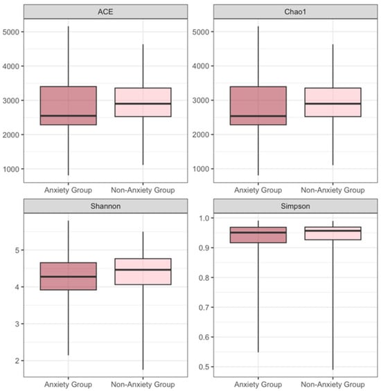 ACE, Chao 1, Shannon entropy, and Simpson index values for the anxiety and non-anxiety groups.