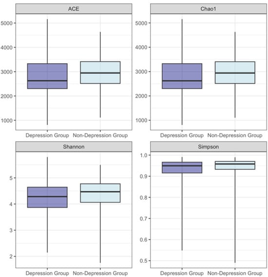 ACE, Chao 1, Shannon entropy, and Simpson index values for the depression and non-depression groups.