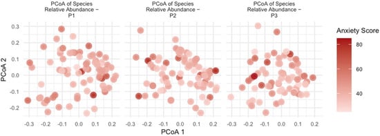 Based on the species-level data, the Bray–Curtis distance was calculated, followed by a PCoA analysis. PCoA scatter plots were generated, as depicted in Figure 4 and Figure 5. These figures illustrate the distinct time points of early, middle, and late pregnancy. The depth of color represents the level of anxiety/depression, with darker colors indicating higher levels. The results of the permutational multivariate analysis of variance (PERMANOVA) model, conducted using the adonis2 function from the vegan package, showed that the anxiety score (R2 = 0.723%), depression score (R2 = 0.731%), anxiety (yes/no) (R2 = 0.651%) and depression (yes/no) (R2 = 0.810%) had a significant impact on the species composition of the gut microbiota during pregnancy (p = 0.001), as shown in Table 6.