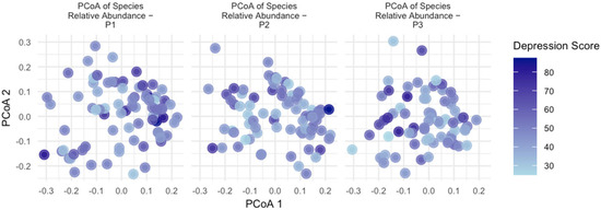 Principal coordinate analysis of the gut microbiome during early, middle, and late pregnancy, colored by depression score. Principal coordinate analysis of all samples based on species-level Bray–Curtis dissimilarity. Darker colors correspond to higher depression scores. Each point represents data from a different research subject.