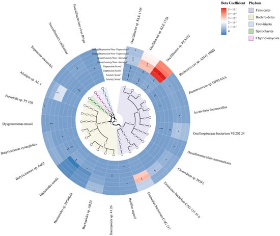 The analysis utilized MaAsLin2 to investigate variations in species associated with anxiety or depression. The unadjusted model considered only the impact of time point factors and subject-specific random effects, without additional covariates. Notably, at a Q-value threshold of less than 0.25, significant associations emerged. Higher anxiety scores correlated with an increased abundance of specific species: Oscillibacter sp. KLE 1728 (estimate = 0.000013, p < 0.001, Q = 0.167), Oscillibacter sp. KLE 1745 (estimate = 0.000004, p < 0.001, Q = 0.167) and Oscillibacter sp. PEA192 (estimate = 0.000024, p < 0.001, Q = 0.167). Additionally, higher depression scores were associated with increased abundance of: Butyricimonas sp. An62 (estimate = 0.000002, p < 0.001, Q = 0.069) and Oscillibacter sp. KLE 1745 (estimate = 0.000003, p < 0.001, Q = 0.131). No significant species-level differences were observed between anxious and non-anxious groups. Table S1 shows the results regarding the association between anxiety, depression, and species (including only results with Q < 0.25). Notably, after grouping based on anxiety or depression status, no significant species differences were observed. Consequently, this analysis only includes the results pertaining to the relationship between anxiety and depression scores and gut-microbiota species.