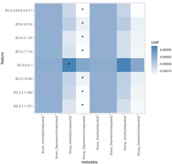 In terms of enzymes, when examining individual repeated measurements and time points within the model, without adjusting for other covariates, the anxious group demonstrated a greater relative abundance of EC.3.5.3.1: arginase (estimate = 0.0000772, p < 0.001, Q = 0.194) compared to the non-anxious group. Meanwhile, compared to the non-depressed group, the depressed group had lower relative abundance of EC.2.1.1.195: cobalt-precorrin-5B (C1)-methyltransferase (estimate = −0.0001280, p < 0.001, Q = 0.109), EC.2.7.8.26: adenosylcobinamide-GDP ribazoletransferase (estimate = −0.0001146, p < 0.001, Q = 0.109), EC.6.3.1.10: adenosylcobinamide-phosphate synthase (estimate = −0.0001255, p < 0.001, Q = 0.109), EC.6.3.5.9.6.3.5.11: cobyrinic acid a,c-diamide synthase (estimate = −0.0001361, p < 0.001, Q = 0.109), EC.2.1.1.131: precorrin-3B C17-methyltransferase (estimate = −0.0001353, p < 0.001, Q = 0.152), EC.6.3.5.10: adenosylcobyric acid synthase (estimate = −0.0001131, p < 0.001, Q = 0.165) and EC.3.7.1.12: cobalt-precorrin 5A hydrolase (estimate = −0.0001341, p < 0.001, Q = 0.186). The results mentioned above can be found in Figure 7 and Table S5. However, in the adjusted covariate models, the association between anxiety/depression and enzymes/pathways was not found to be statistically significant, whether based on anxiety or depression scores or in anxiety/depression groupings.