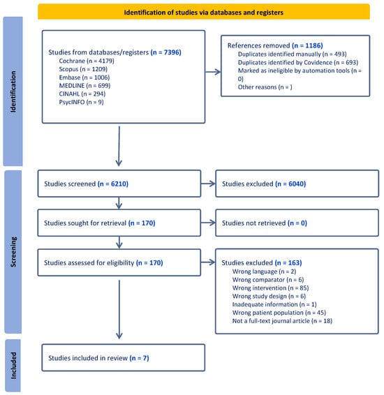 The initial search yielded 7396 studies. After removing 1186 duplicates, 6040 articles were excluded based on their title and abstract. A total of 170 full-text articles were retrieved, and 163 studies were excluded during screening. The primary reason for exclusion was incorrect intervention type (n = 85), with most excluded interventions lacking personalisation or comprehensive lifestyle interventions involving both diet and physical activity that could not identify separate dietary impacts (Figure 1). A total of seven articles met all inclusion criteria and were included in this review [,,,,,,].