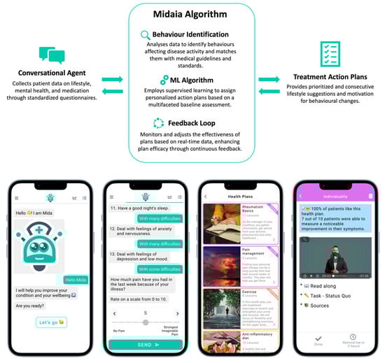 Mida Rheuma App (Midaia, Germany) was used to assess PROM in both groups, or to additionally offer lifestyle counselling in the active counselling group. The Mida Rheuma App is part of the Midaia Software, version 1, which is CE-certified software (UDI-DI 4260731370018) to monitor disease burden and treat patients with RA, PsA, or axSpA using a personalized approach to improve disease activity and physical impairment. The conformity with general safety and performance requirements based on clinical data has been demonstrated previously []. The evaluation of the clinical performance of the Midaia Software was based on the general safety and performance requirements and verification according to the Medical Devise Regulation. The software comprises (1) the Conversational Agent which collects patient data on lifestyle factors, mental health, and medication using standardized questionnaires. Based on this, personal behaviors that influence disease activity and physical impairment are identified. They are cross-checked with recommendations from medical guidelines [,,,,,,,,,,,] and medical standards for app development as issued by EULAR [] to match patients with a personalized therapy plan (series of treatment action plans). The Midaia algorithm uses this data as a basis for determining the order of prescribing interventions. (2) Treatment Action Plans consist of consecutive and prioritized lifestyle suggestions and provide motivation to achieve behavioral changes compatible with recommendations. The application of a specific action plan is determined by a supervised learning algorithm that manages the personalized assignment of action plans. This algorithm employs a multifaceted baseline assessment, using key indicators such as age, sex, diagnosis, dietary and mental health profiles, level of social interaction, patient’s understanding of disease and treatment modalities, functional status of the musculoskeletal system, physical activity levels, disease activity, fatigue, harmful habits, sleep quality, and others. These indicators are analyzed to establish a prioritized, initial array of tailored action plans, each uniquely suited to the individual patient’s profile. This process integrates machine learning techniques, including categorical and quantitative variable analysis, to split and prune the initial set of plans. Subsequently, a dynamic weighting system is employed, wherein each plan is assigned coefficients based on two crucial criteria: the urgency of the patient’s needs (e.g., the disparity between the patient’s current nutritional habits and the recommended anti-inflammatory diet) and the potential impact of the intervention (according to the levels of evidence). Notably, certain plans receive higher priority coefficients, especially those targeting mental health improvements, as these have been shown to enhance overall plan efficacy and patient adherence [,,]. The action plans are offered and explained to the patients in a chat mode.