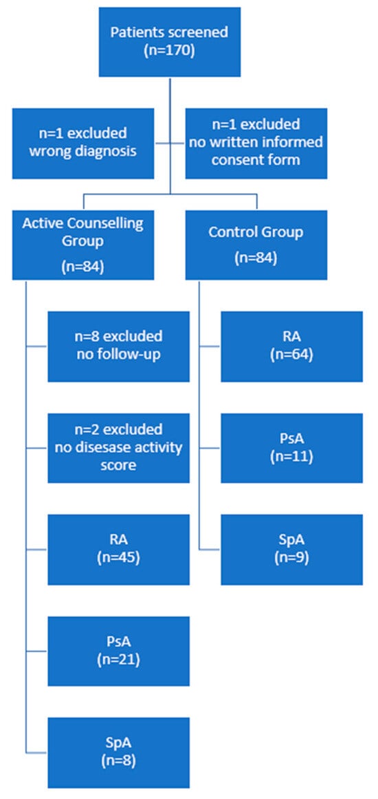 A total of 170 patients were screened for inclusion and 168 were alternatingly randomized to the active counselling or control group (PROM only). After exclusion of ineligible cases, 158 patients were included in the study, of whom 74 were allocated to the active counselling group, and 84 to the control group (Figure 2). Patients’ characteristics are summarized in Table 1. For a subgroup of 43 RA patients, DAS28 measurements were available for additional analyses (17 in the active counselling group (age 56.2 ± 8.4 years, 73% female, disease duration 9.2 ± 8.6 years), 26 in the control group (age 54.7 ± 11.0 years, 72.6% female, disease duration 13.2 ± 9.6 years)). Treatment regimens were variable across groups, most commonly methotrexate (41.8%), other conventional synthetic disease modifying antirheumatic drugs (16.5%), TNF inhibitors (34.8%), Janus kinase inhibitors (9.5%), Interleukin (IL) 6 inhibitors (7.6%), and IL-17 inhibitors (5.1%). Under 5% of total patients received abatacept, IL23 inhibitors, or rituximab. There were no obvious disparities between the control group and the active counselling group.