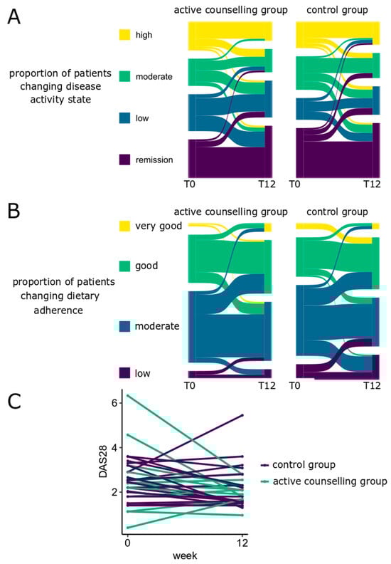 Outcome parameters at baseline and after 12 weeks of active counselling via app. (A,B) The diagrams show the proportion of patients who changed to a different disease state (A) or dietary adherence state (B) from the start (T0) to the end of the study after 12 weeks (T12). The thickness of the line is proportional to the number of patients changing the respective state. For instance, in the active counseling group, the proportion of patients downgrading the disease activity state is greater than in the control group (A). Disease activity is categorized based on disease-specific instruments (A), and dietary adherence (B) to a healthy diet measured via the Mediterranean Diet Adherence Screener (MEDAS) and categorized into low (0–3), moderate (4–6), good (7–9), or very good (10–12) adherence of 158 patients with inflammatory arthritis. (C). Disease activity was measured via the Disease Activity Score 28 (DAS28) in the subgroup of 43 patients with rheumatoid arthritis at the start and end of the study after 12 weeks.