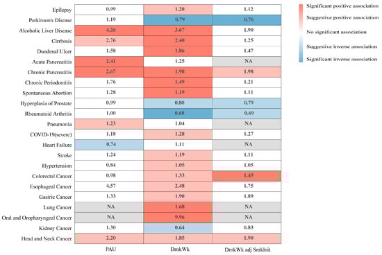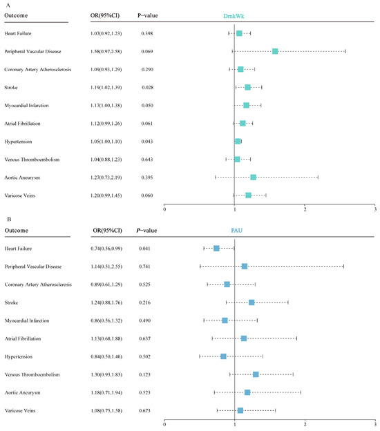 Findings indicate that genetic predisposition to alcohol consumption, independent of smoking, was significantly correlated with a decreased risk of Parkinson’s disease (OR = 0.76 and 95%CI: 0.64–0.91), hyperplasia of the prostate (OR = 0.79 and 95%CI: 0.65–0.96), and rheumatoid arthritis (OR = 0.69 and 95%CI: 0.49–0.96). Conversely, it was associated with an increased risk of chronic pancreatitis (OR = 1.98 and 95%CI: 1.14–3.44), colorectal cancer (OR = 1.45 and 95%CI: 1.13–1.85), and head and neck cancers (OR = 1.90 and 95%CI: 1.10–3.28). Genetic predisposition to problematic alcohol use showed a strong association with an increased association with alcoholic liver disease (OR = 4.26 and 95%CI: 1.98–9.19), cirrhosis (OR = 2.76 and 95%CI: 1.22–6.22), acute pancreatitis (OR = 2.41 and 95%CI: 1.52–3.82), chronic pancreatitis (OR = 2.67 and 95%CI: 1.45–4.91), pneumonia (OR = 1.23 and 95%CI: 1.01–1.50), and head and neck cancer (OR = 2.20 and 95%CI: 1.03–4.73). And it was associated with a decreased risk of heart failure (OR = 0.74 and 95%CI: 0.56–0.99) (Figure 1; Supplementary Materials: Tables S6–S9).