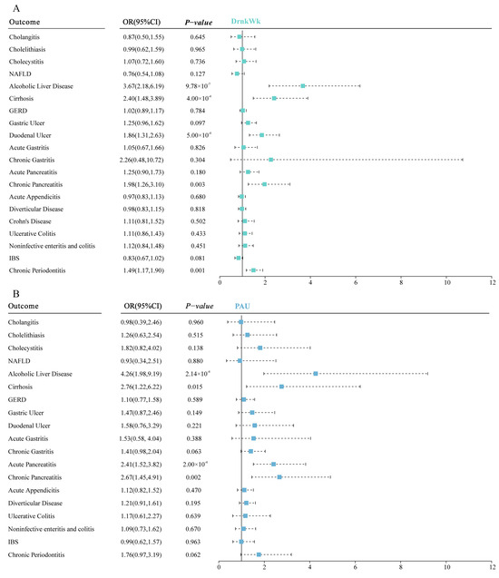 Genetic predisposition to alcohol consumption was associated with an increased risk of alcoholic liver disease (OR = 3.67 and 95%CI: 2.18–6.19), cirrhosis (OR = 2.40 and 95%CI: 1.48–3.89), duodenal ulcer (OR = 1.86 and 95%CI: 1.31–2.63), chronic pancreatitis (OR = 1.98 and 95%CI: 1.26–3.10), and chronic periodontitis (OR = 1.49 and 95%CI: 1.17–1.90), as shown in Figure 3 and Supplementary Materials: Table S6. Similarly, genetic susceptibility to problematic alcohol use was associated with an increased risk of alcoholic liver disease (OR = 4.26 and 95%CI: 1.98–9.19), cirrhosis (OR = 2.76 and 95%CI: 1.22–6.22), and both acute (OR = 2.41 and 95%CI: 1.52–3.82) and chronic pancreatitis (OR = 2.67 and 95%CI: 1.45–4.91), a finding detailed in Figure 3 and Supplementary Materials: Table S7.