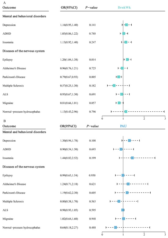 (A) Meta-analysis results of the association between genetic liability to alcohol consumption and the risk of nervous system diseases and mental and behavioral disorders. (B) Meta-analysis results of the association between genetic liability to problematic alcohol use and the risk of nervous system diseases and mental and behavioral disorders. The estimates represent odds ratios (ORs) with 95% CIs for one standard deviation increase in genetic liability to alcohol consumption and problematic alcohol use. ADHD: attention deficit hyperactivity disorder; ALS: amyotrophic lateral sclerosis.