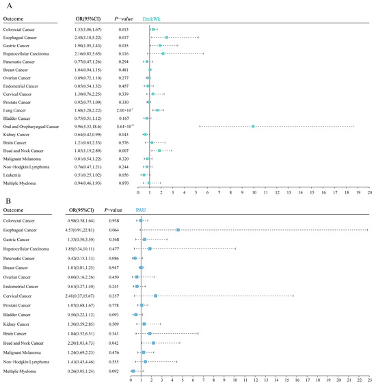 (A) Meta-analysis results of the association between genetic liability to alcohol consumption and the risk of neoplasms. (B) Meta-analysis results of the association between genetic liability to problematic alcohol use and the risk of neoplasms. The estimates represent odds ratios (ORs) with 95% confidence intervals (CIs) for one standard deviation increase in genetic liability to alcohol consumption and problematic alcohol use.