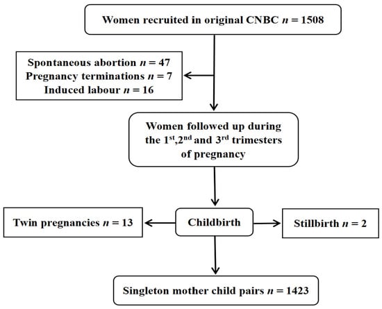 This study was based on the China National Birth Cohort (CNBC). Couples in early pregnancy who came for their first antenatal checkup at Ma’anshan Maternal and Child Health Center in Anhui Province, China, from May 2017 to September 2018 were recruited. The inclusion criteria were as follows: ① maternal age ≥ 18 years; ② spontaneous pregnancy; ③ planning to have routine obstetric checkups and delivery at the Center; ④ willingness to be followed up. Notably, women were included in the study regardless of their parity. Initially, a total of 1508 families were enrolled in the cohort. After excluding adverse pregnancy outcomes and twin births, 1423 families remained for inclusion in the study. The flowchart of the participants is shown in Figure 1.