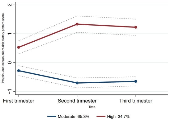 For the protein- and micronutrient-rich dietary pattern trajectory, the majority (65.3%) of women followed a “moderate protein- and micronutrient-rich dietary pattern trajectory.” This means this group of women had a moderate protein- and micronutrient-rich dietary pattern score at each time point. Another 34.7% of women followed a “high protein- and micronutrient-rich dietary pattern trajectory”, meaning they had a high protein- and micronutrient-rich dietary pattern score at each period (Figure 2).