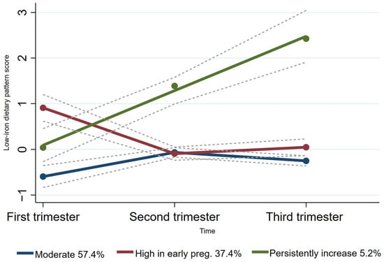 For the low-iron dietary pattern trajectory, the majority (57.4%) of women followed a “moderate” low-iron dietary pattern trajectory and 37.4% of women followed a “high in early pregnancy” low-iron dietary pattern trajectory. Furthermore, only 5.2% of women followed a “persistently increased” low-iron dietary pattern trajectory (Figure 3).